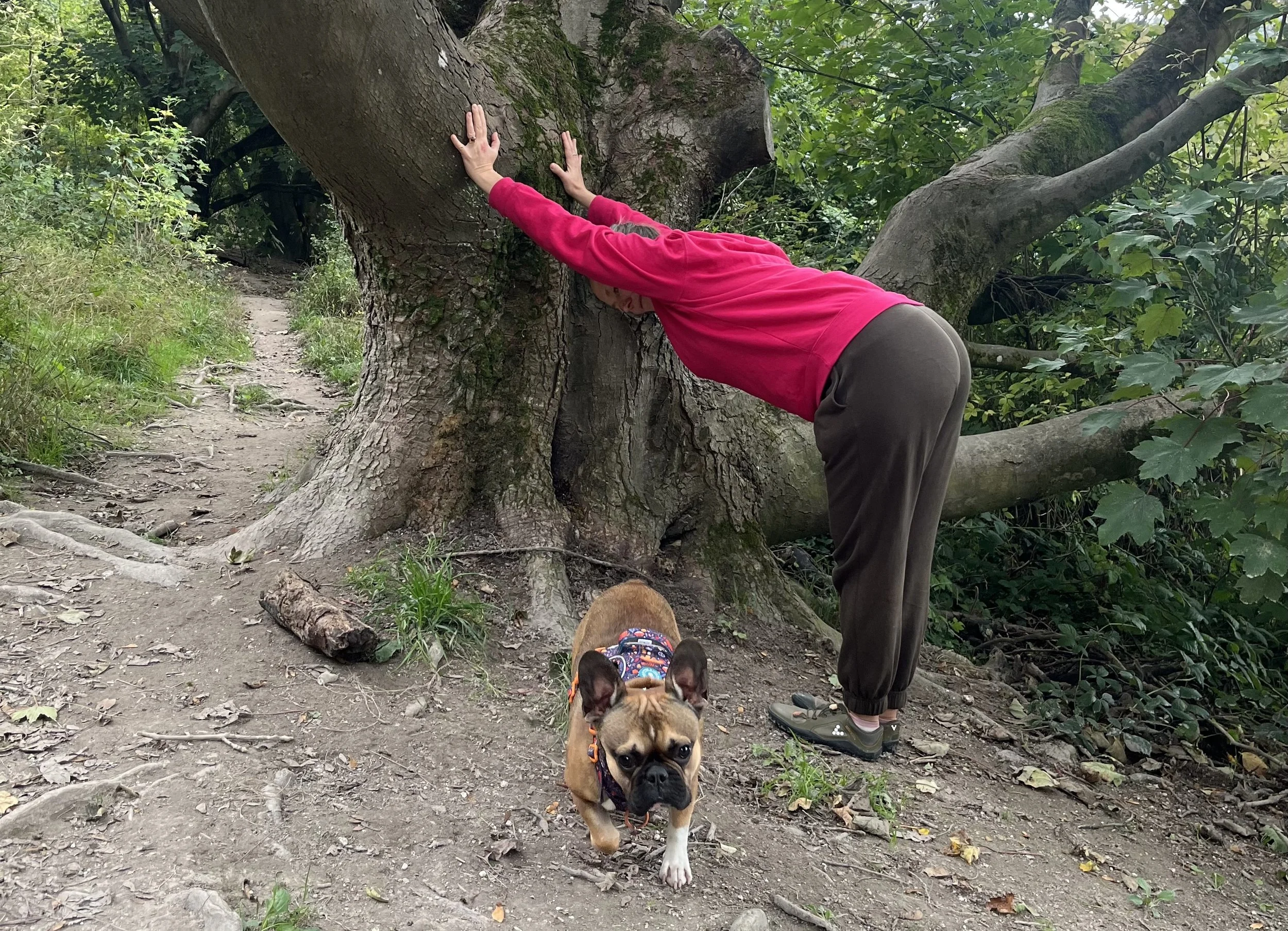 You don’t need your hands on the ground for this variation. And you can do it on your walk to stretch your legs and back. Or to catch your breath. Perfect after a long hike or run with your dogs.